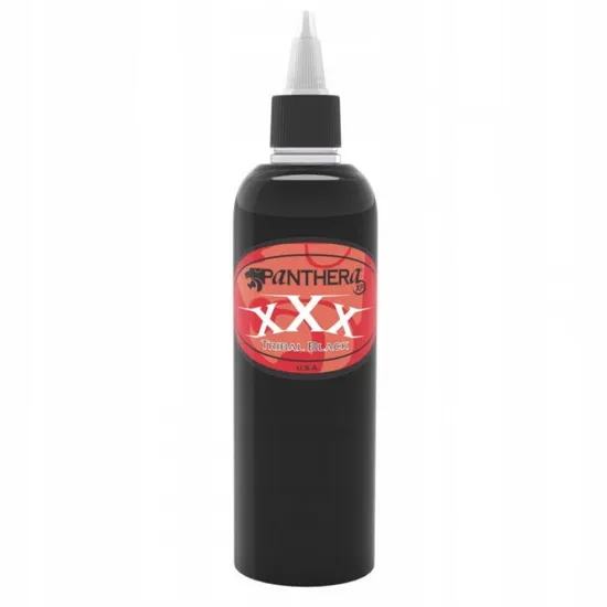 Краска для покраса Panthera XXX Black Tribal Ink. Новая молекулярная технология сделала краску устойчивой к выгоранию на солнце. На коже дает насыщенный черный глубокий бархатный оттенок и глянцевый эффект. Цвет не тускнеет, не выпадает при заживлении и не уходит в сине-зеленый оттенок. Ложится равномерно и легко. Один из самых черных пигментов для покраса.